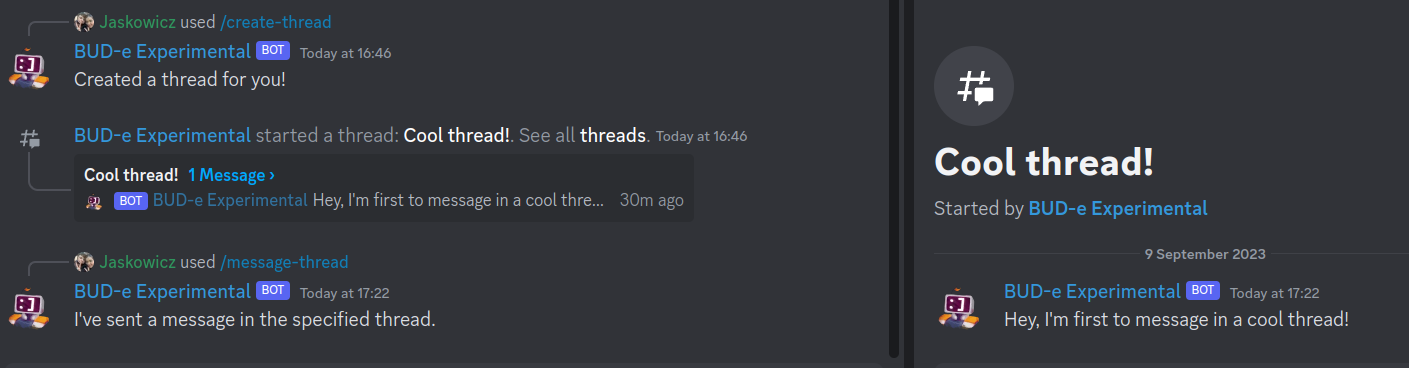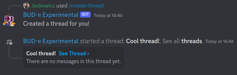 #include <dpp/dpp.h>   int main() {     /* Create the bot */     dpp::cluster bot("token");       bot.on_log(dpp::utility::cout_logger());       /* The event is fired when the bot detects a message in any server and any channel it has access to. */     bot.on_slashcommand([&bot](const dpp::slashcommand_t& event) {         /* Check which command they ran */         if (event.command.get_command_name() == "create-thread") {             /* Here we create a thread in the current channel. It will expire after 60 minutes of inactivity. We'll also allow other mods to join, and we won't add a slowdown timer. */             bot.thread_create("Cool thread!", event.command.channel_id, 60, dpp::channel_type::CHANNEL_PUBLIC_THREAD, true, 0, [event](const dpp::confirmation_callback_t& callback) {                 if (callback.is_error()) {                     event.reply("Failed to create a thread!");                     return;                 }                                  event.reply("Created a thread for you!");             });         }     });       bot.on_ready([&bot](const dpp::ready_t& event) {         if (dpp::run_once<struct register_bot_commands>()) {             /* Create and register the command */             bot.global_command_create(dpp::slashcommand("create-thread", "Create a thread!", bot.me.id));         }     });       bot.start(dpp::st_wait);       return 0; }